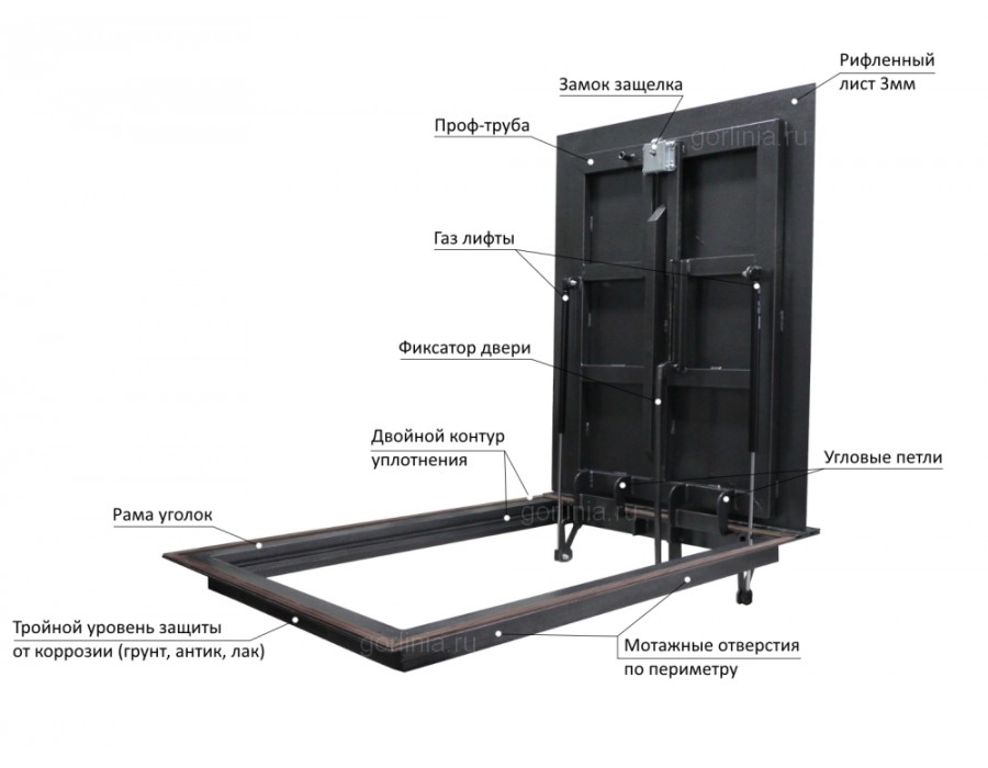 Верхняя сторона рифленой крышки используется "как есть" без дополнительной отделки. Закрыват спуск в подполье в гаражах и на паркингах, на складах и производствах - везде, где требуется устойчивость к повышенным нагрузкам. Подлежит установке внутри помещения или на улице под навесом без прямого попадания осадков.