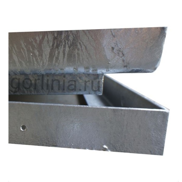 Рама исполнена из сортового уголка 50х5. Каркас двери с внешним кантом сварен с обвязкой профилем 50х25 с ячейкой в осях 300х300. Дно крышки закрыто оцинкованным листом 2 мм клепочным соединением с расчетной глубиной под настил декинга.