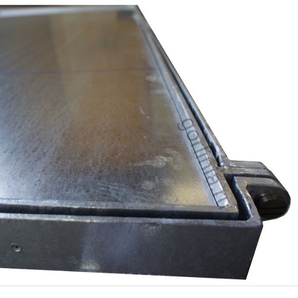 Рама сварена из сортового уголка 50х5. Каркас двери с внешним кантом выполнен в обвязкой из профиля 50х25 с ячейкой в осях 300х300. Дно крышки закрыто оцинкованным листом 2 мм с расчетной глубиной 20 или 30 мм в зависимости от толщины доски декинга. Элемент петли реализован выносными разъемными шарнирами.