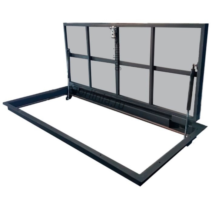 Каркас полотна сварен из трубы 30х20 в комбинированных положениях с заполнением ГВЛ в уровень коробки под облицовку плиткой по принципу невидимки с сохранением рисунка и швов раскладки керамогранита в комнате. Для открывания лаза в погреб 1150х700 используется съемная ручка.