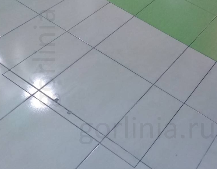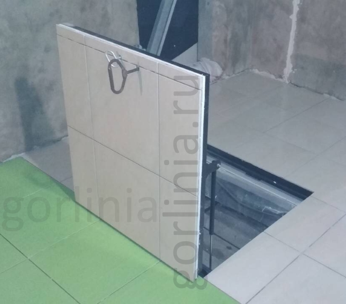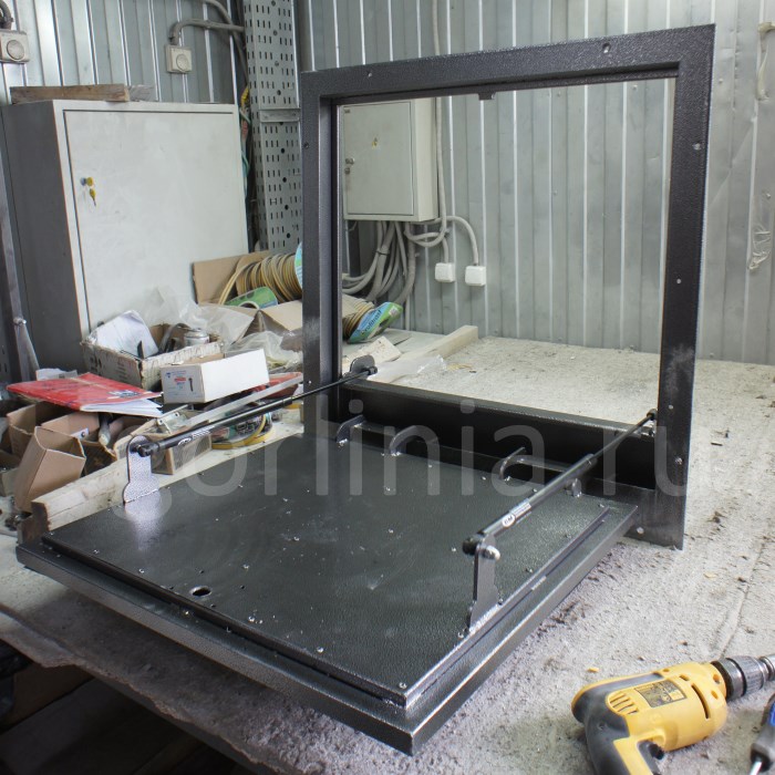 Каркас выполнен из уголка 50х50 мм. Установка производится методом погружения в напольный проем с наличником. Внешний габарит: 690х690 мм.