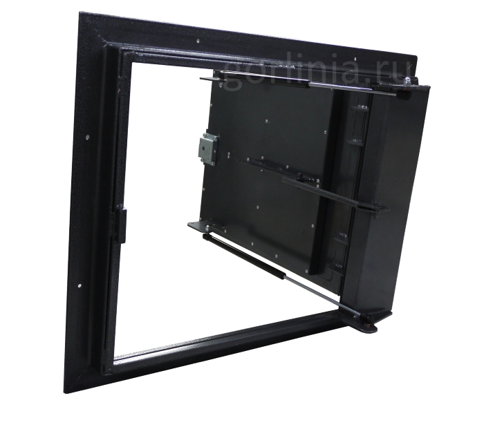 Дверка, зашитая ГВЛ, лежит в одной плоскости с полкой рамы, вся фурнитура расположена внутри: поверхность подготовлена под облицовку плиткой, укладку ламината.